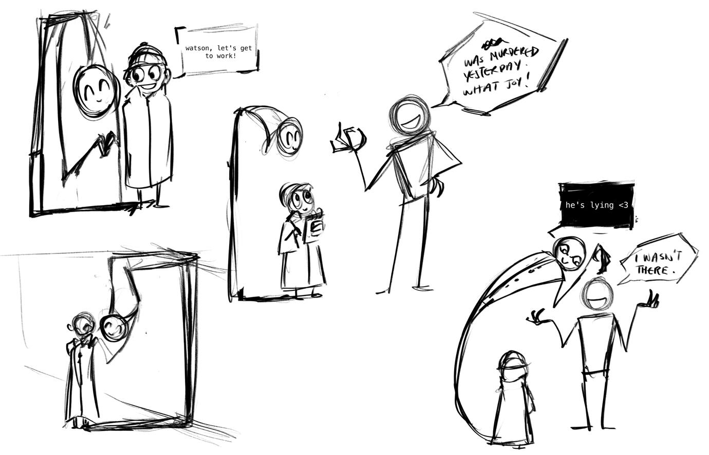 I envisioned the game to be a point-and-click style murder mystery game. I also felt it was fun if anyone non-important showed up faceless and generic, as if deliberately obfuscated and made uninteresting to minimise Sherlock's interest in them.
