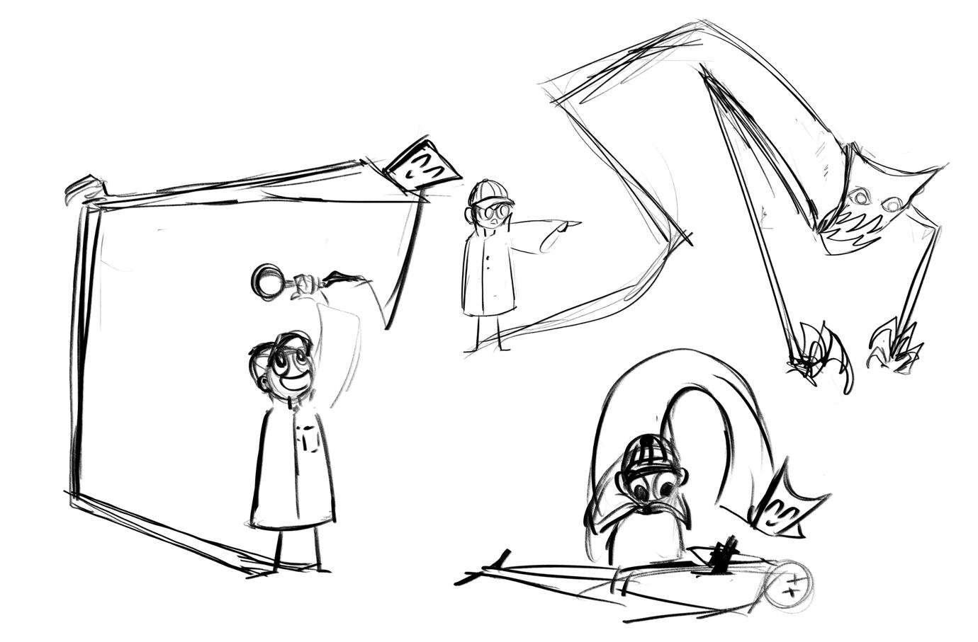 My initial explorations focused on trying to balance 'cute' and 'creepy' - I wanted him to feel innocent and stand out, but still fit within the strange world he lived in.