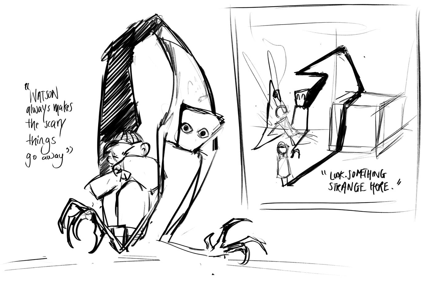 In my earlier iterations of Watson I explored the idea of him being paper-like - however, I liked the idea of making him a distorted mirror of Sherlock - they share the same rough silhouette, but Watson's is distinctively more sinister.